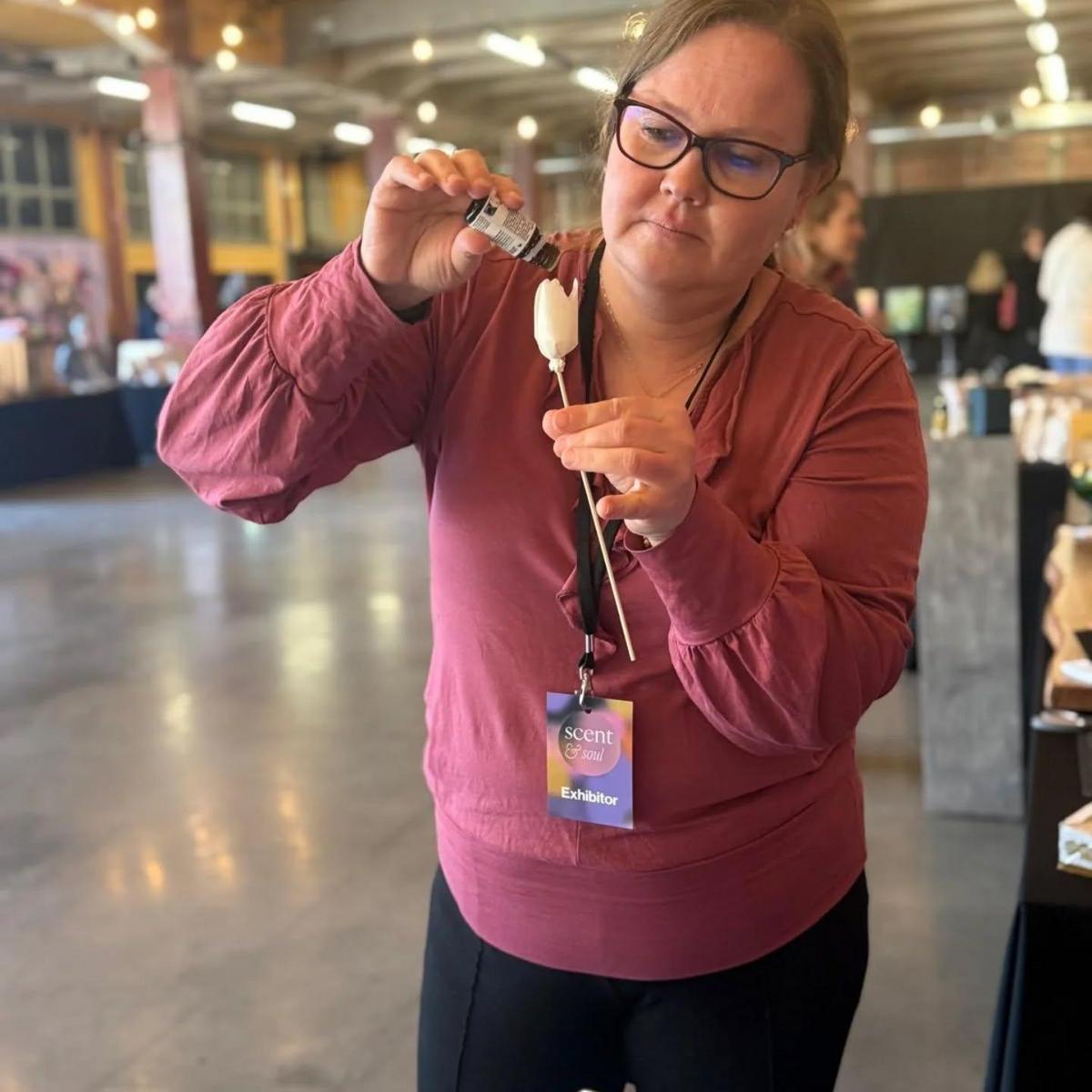 Turvallinen aromaterapia yhdistys vietti pitkästä aikaa päivän tapahtumassa jalkautuneena tuoksujen ystävien pariin. Keskustelimme päivän aikana paljon yhdistyksestä, eteerisistä öljyistä ja aromaterapian yksityiskohdista. Saimme monia kiinnostuneita tuoksuttelemaan eteerisiä öljyjä ja arvuuttelemaan sokkona mikä mikäkin on. Tämä oli yllättävän vaikeaa! Kokeile vaikka kaverin kanssa: Anna kaverin haistaa eteeristä öljyä ilman että kerrot mistä öljystä on kyse. Meneekö arvaus oikein? Eucalyptus sekoittuu rosmariiniin tai piparminttuun. Appelsiinista ei olla ihan varmoja; kyseessä on sitrus mutta onko se sitruuna, greippi, lime vai appelsiini. Seetripuusta tulee mieleen ylang ylang tai patsuli. Ei ole helppoa navigoida tuoksuviidakossa mutta sokkotuoksuttelu on todella opettavaista!